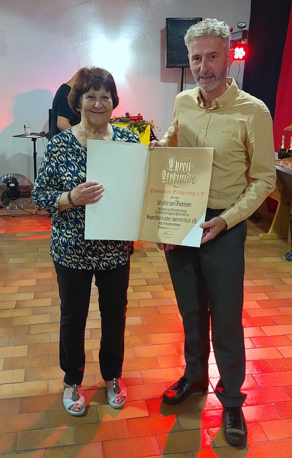 Heute kann der TC Feldgeding auf eine 50-jährige Vereinsgeschichte zurückblicken. Eine wichtige Person war und ist hierbei die 1. Vorsitzende Georgine Brieke, die sich seit über 40 Jahren in der Vorstandschaft engagiert. Am 14.Oktober wurde im Saal der Gastwirtschaft “Amperstubn” das 50-jährige Gründungsfest gefeiert. Jung und Alt versammelten sich, auch Gründungsmitglieder der ersten Stunde waren anwesend. Der BLSV, vertreten durch Bernhard Vieregg, überreichte zum Jubiläum eine Urkunde und einen Sachgutschein.