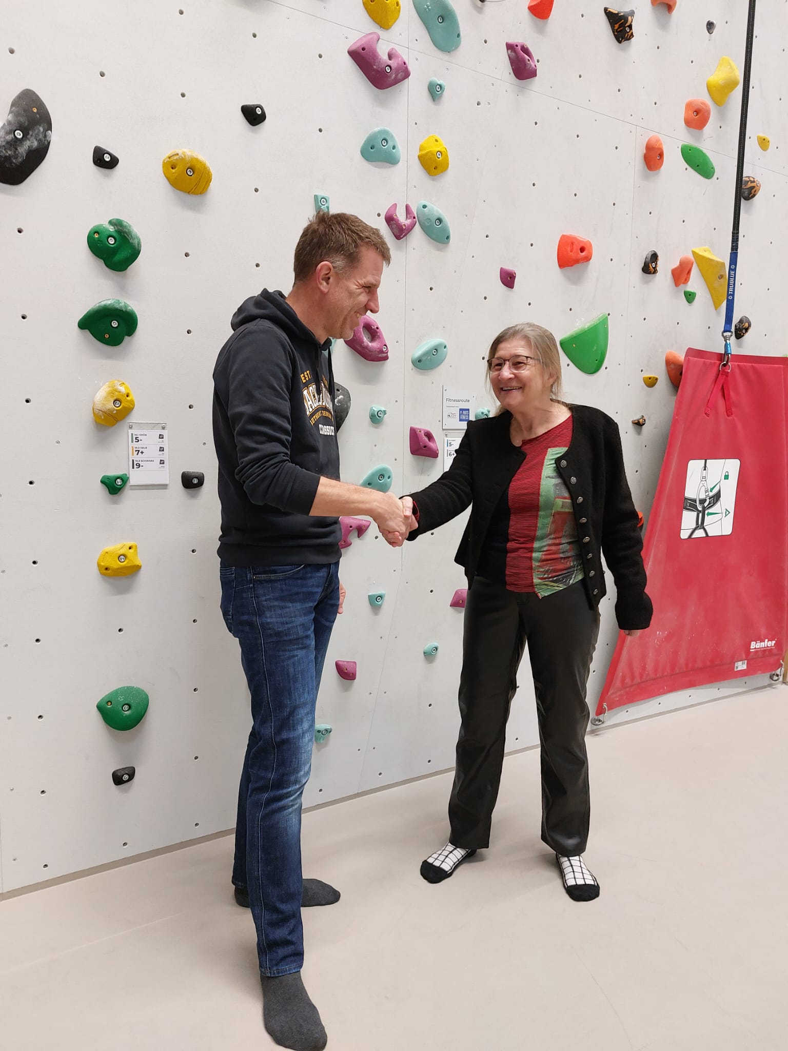 Auch wenn man – bedauerlicherweise – auf die Gelder des BLSV immer noch wartet, betonte sie die tolle sportliche Einrichtung, an der sich nach dem offiziellen Teil auch Bürgermeister Josef Dollinger, Grünen-Fraktionschef Dr. Michael Stanglmaier und die Sportreferentin Verena Beibl ran wagten. Und das mit sehr bemerkenswertem Erfolg. Alle drei schafften es, oben anzuschlagen.