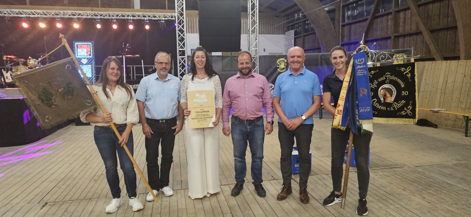 Beim Festkommers zum 75-jährigen Jubiläum des RFV Ostheim, dem zweitgrößten der 9 Reitvereine im Landkreis Rhön-Grabfeld konnte der BLSV-Kreis und Bezirksvorsitzende Klaus Greier die Ehrenurkunde des BLSV mit einem Gutschein des BLSV Bezirks überreichen