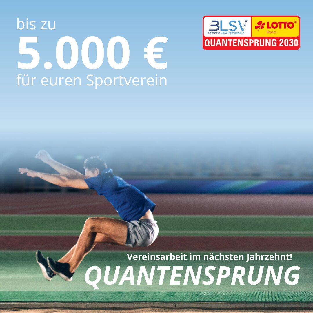 Der Bayerische Landes-Sportverband und die Staatliche Lotterie- und Spielbankverwaltung rufen im Rahmen der Aktion „Quantensprung“ zur Einreichung kreativer Ideen aus dem Vereinssport auf. Dabei zählen nicht nur große Konzepte – auch kleine Maßnahmen können eine große Wirkung entfachen! Auf die besten Projekte warten bis zu 5.000 Euro für die Vereinskasse! Alle Details und das Online-Bewerbungsformular findet ihr hier
