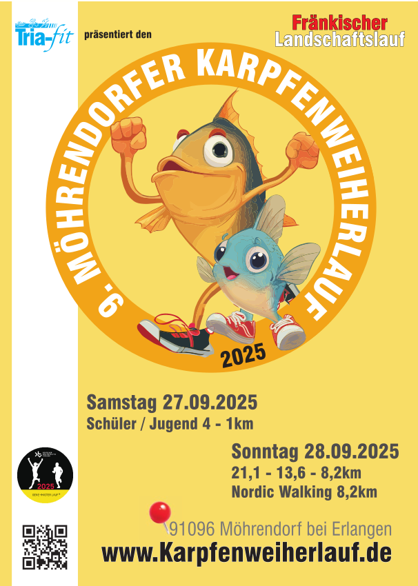 Mittelfranken Erlangen-Höchstadt Karpfenweiherlauf 2025 – 27./28.9.- jetzt anmelden Beitrag teilen: Inhalt Am Samstag, den 27.9. und Sonntag, den 28.9. findet der 9te Möhrendorfer Karpfenweiherlauf statt. Hier geht es direkt zur Info- und Anmeldeseite!