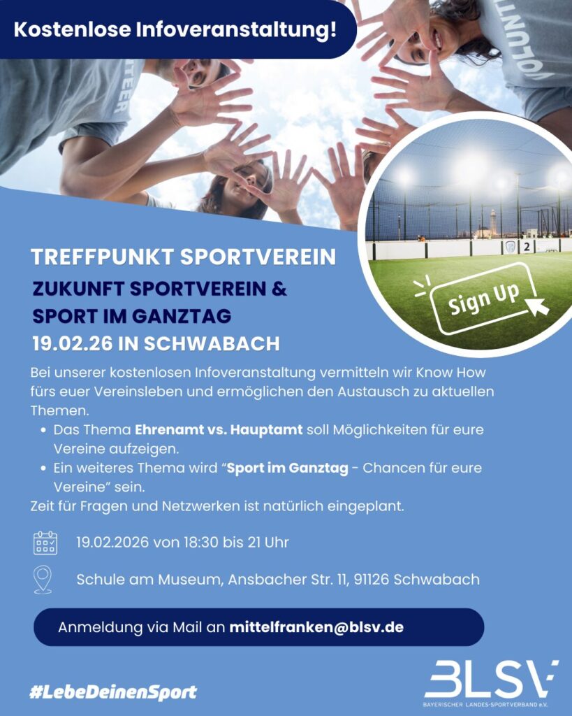 Mittelfranken Ansbach Erlangen-Höchstadt Fürth Stadt und Land Neustadt-Aisch Nürnberg Nürnberger Land Roth/Schwabach Weißenburg/Gunzenhausen Wir laden ein zum TreffPunkt SportVerein am 19.02.26 in Schwabach Beitrag teilen: Inhalt Anmeldung via Mail an mittelfranken@blsv.de – wir freuen uns auf den Austausch mit Euch!